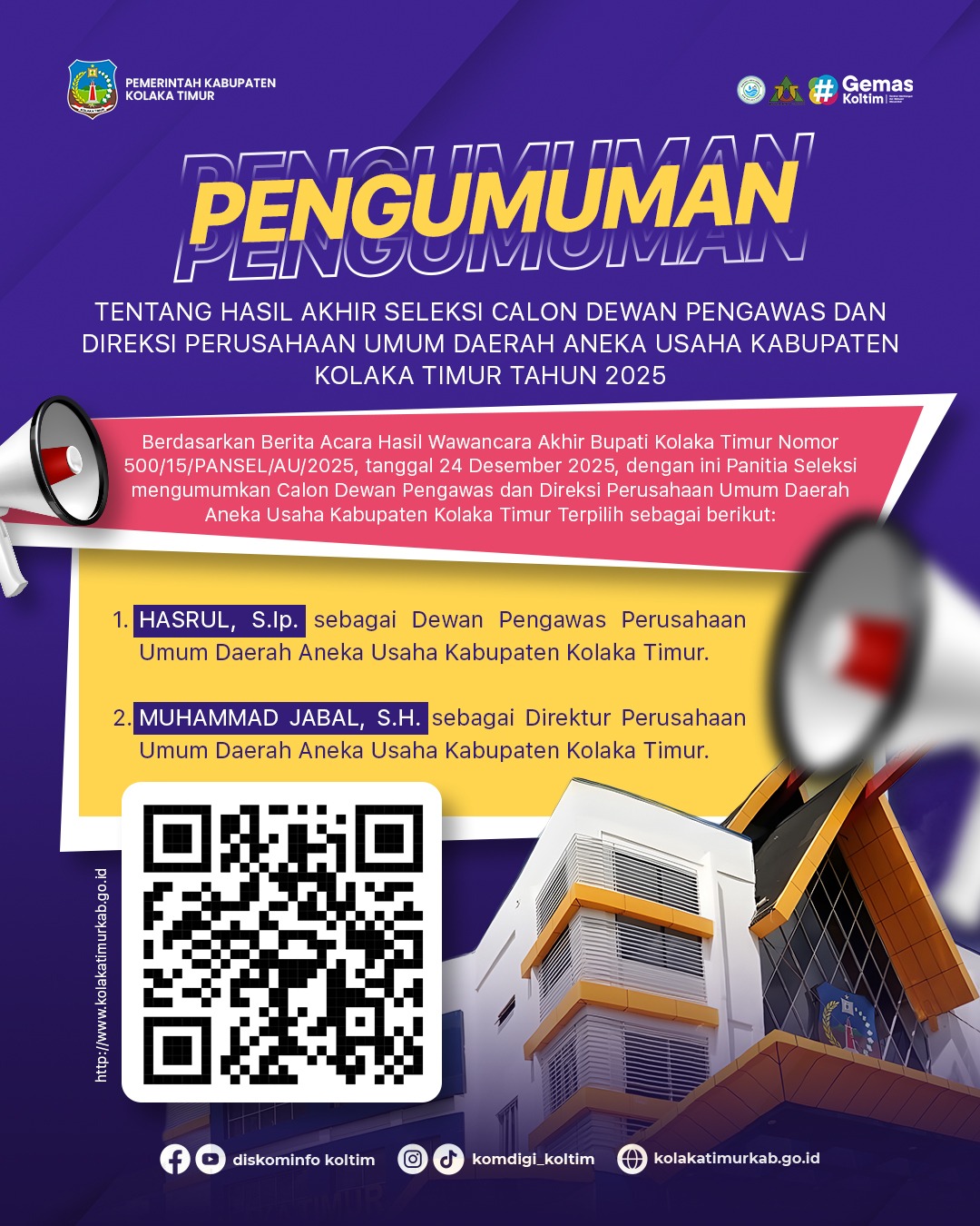 BERIKUT KAMI SAMPAIKAN HASIL AKHIR SELEKSI CALON DEWAN PENGAWAS DAN DIREKSI PERUSAHAAN UMUM DAERAH ANEKA USAHA KABUPATEN KOLAKA TIMUR TAHUN 2025: