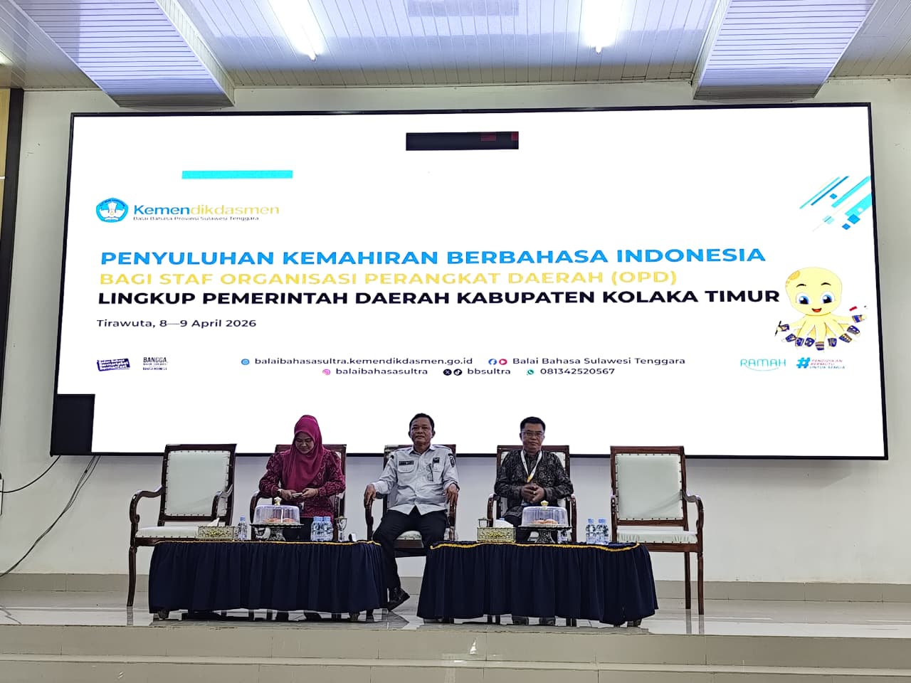 Kegiatan yang terselenggara bersama Balai Bahasa Provinsi Sulawesi Tenggara ini, dilaksanakan di Aula Rujab Bupati Koltim di Desa Matabondu Kecamatan Tirawuta, Rabu (8/4/2026), yang dibuka Asisten III Setda Koltim Irwan Kara, S.Sos., MM, mewakili Sekretaris Daerah Koltim.